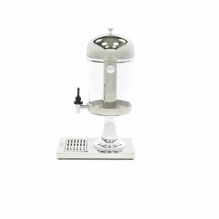 Este dispensador de bebidas com um belo design é adequado para a apresentação profissional de sumos e outras bebidas. Além disso, também pode utilizar o dispensador de bebidas no seu estabelecimento de restauração para auto-serviço. Por exemplo, num buffet de pequeno-almoço em hotéis ou na ilha de bebidas em restaurantes ou cafetarias de fast food. Para além de sumo de laranja e sumo de maçã, o distribuidor de bebidas é também adequado para servir água, refrigerantes e limonada fresca. Há espaço para 1 x 8 litros neste dispensador e pode utilizá-lo em combinação com copos de max. 15 cm de altura.